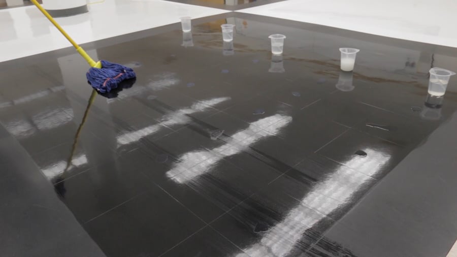 Mix our Scrubbing or Stripping solution in a mop bucket with water. Remove dust and debris from surface. Floor Stripping And Waxing Job.